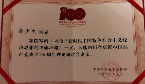 我院教师郭少飞作为社科理论界代表受邀出席,在下午分论坛进行主题分享。这次理论研讨会,是四川省庆祝中国共产党成立100周年活动的一项重要内容。与会代表紧扣主题,围绕学习习近平总书记“七一”重要讲话,结合各自思想和工作实际,谈认识体会、作交流发言。大家一致认为,习近平总书记“七一”重要讲话贯通历史、现实、未来,贯通伟大斗争、伟大工程、伟大事业、伟大梦想,贯通国内国际,高屋建瓴、思想深邃,内涵丰富,把我们党对共产党执政规律、社会主义建设规律、人类社会发展规律的认识提升到了新高度,是一篇马克思主义纲领性文件,是新时代中国共产党人不忘初心、牢记使命的政治宣言,是我们党团结带领人民以史为鉴、开创未来的行动指南,具有重大的政治意义、理论意义、实践意义。