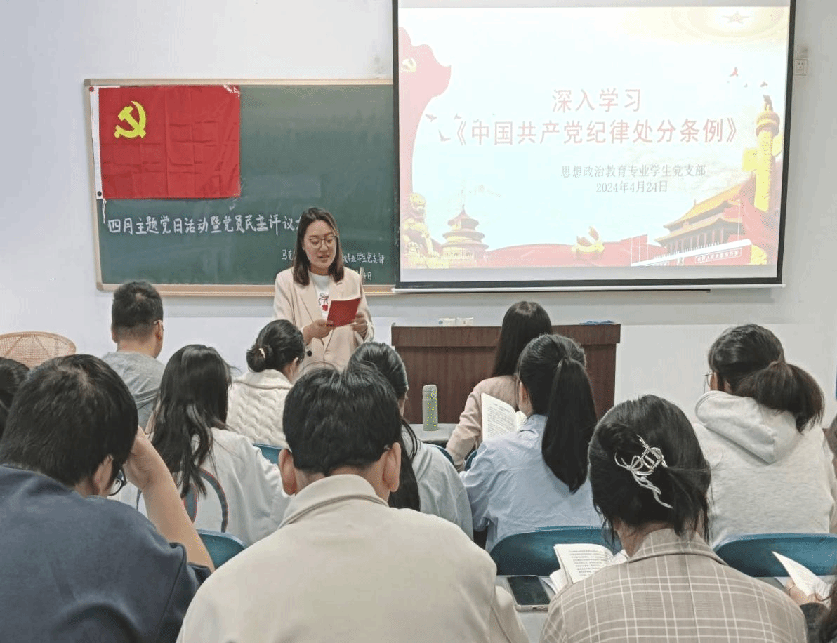 为推动党纪学习教育走深走实,增强政治自觉和思想自觉,教育引导全体党员强化纪律意识,4月24日上午,william威廉英国思想政治教育专业学生党支部于硕勋楼703开展“深入学习《中国共产党纪律处分条例》”的主题党日活动。本次活动由学生党支部书记邓佳主持,全体学生党员参加。