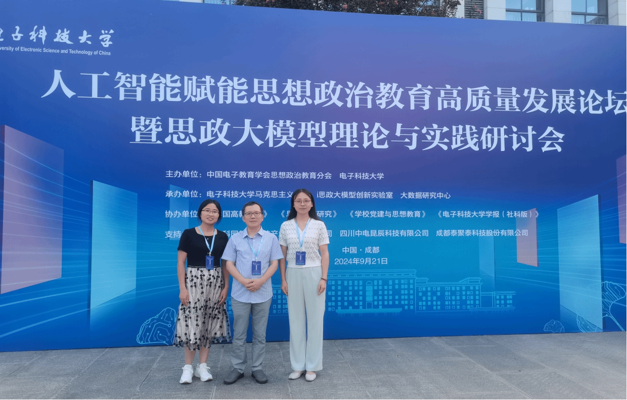 为深入学习贯彻党的二十届三中全会和全国教育大会精神,积极推动思想政治教育数字化转型与高质量发展,中国电子教育学会思想政治教育分会和电子科技大学9月21日在电子科技大学举办了“人工智能赋能思想政治教育高质量发展论坛暨思政大模型理论与实践研讨会”。马院竭仁贵院长和青年教师郝敏汐、程玉华参加了此次研讨会。
