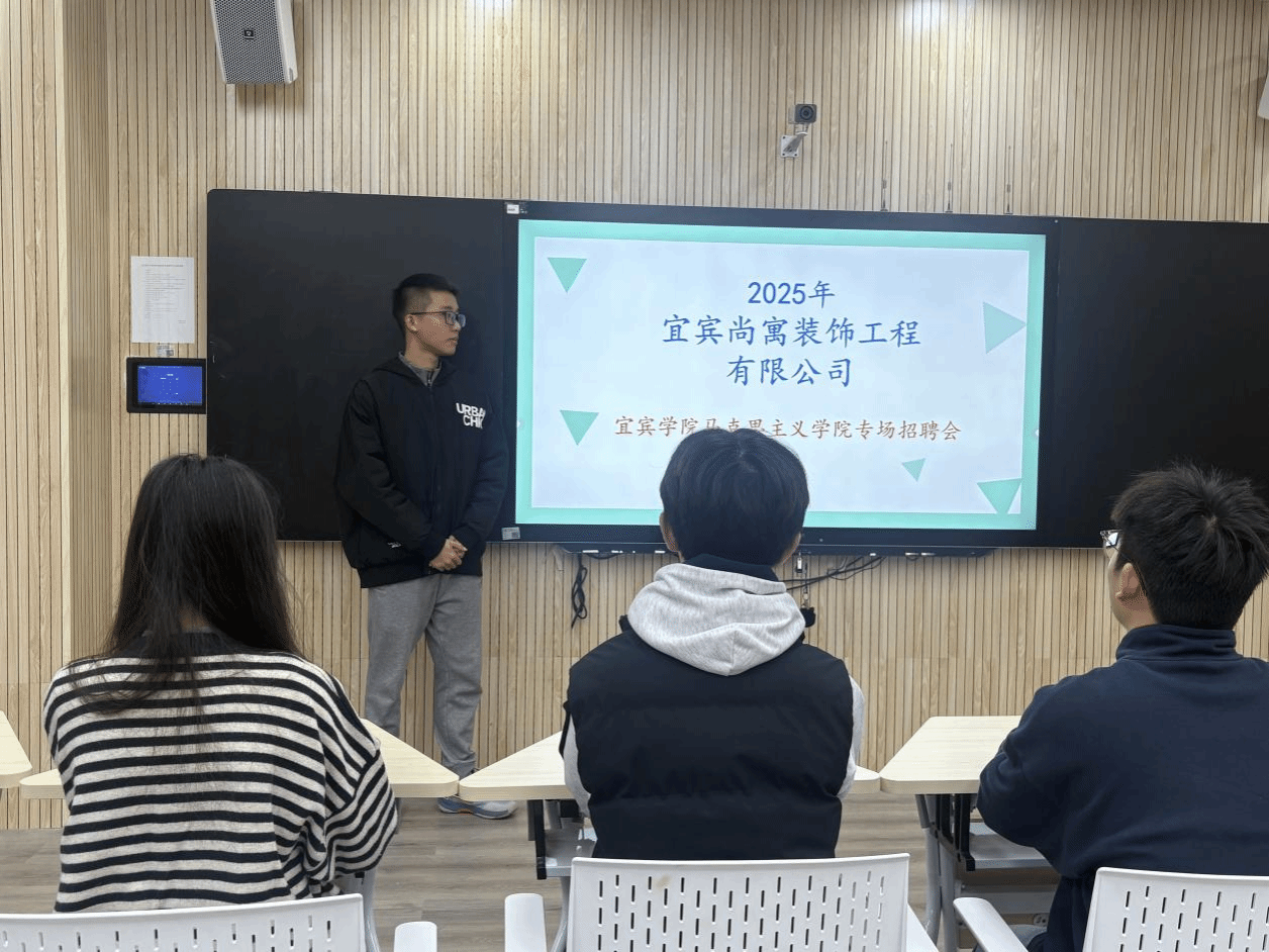 宜宾尚寓装物工程有限公司总经理向在场学生系统介绍了公司概况。重点解读了公司“品质为本、诚信立企、创新驱动、服务至上”的核心企业文化,以及“打造精品工程、赋能美好生活、成就员工成长”的发展理念,让学生们对装修工程行业的发展前景和企业社会价值有了全面认知。针对本次招聘,发布了项目助理、客户经理、行政综合岗、家装顾问等多个适配岗位,从岗位职责、任职要求、薪酬福利体系及“基层轮岗—专业深耕—管理晋升”的职业发展通道进行了细致讲解,并特别肯定了马院毕业生在思政素养和综合能力上的独特竞争力,诚挚邀请同学们加入企业。